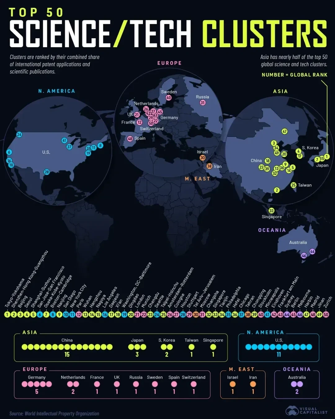 세계지식재산권기구(WIPO)의 데이터를 기반으로 비주얼 캐피탈리스트(Visual Capitalist)가 분석한 '세계 50대 과학기술 클러스터' 보고서에 따르면, 아시아가 전 세계 과학기술 허브의 절반 가까이를 차지하며 막강한 영향력을 과시하고 있습니다.