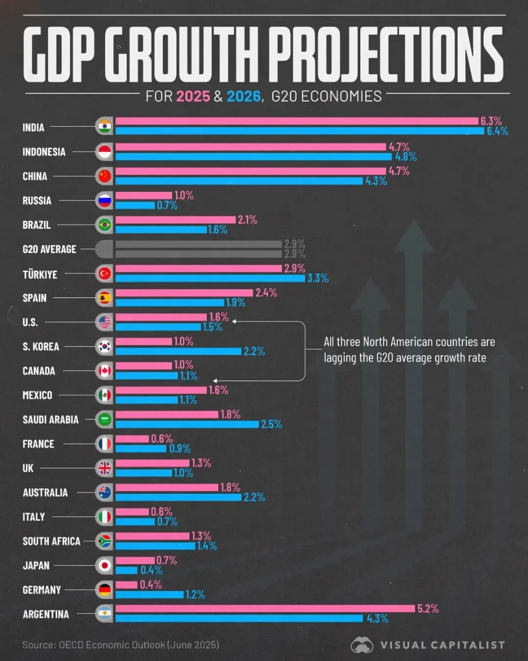 2025년과 2026년 G20 주요국들의 경제 성장 전망치가 발표되었습니다. OECD 경제 전망(2025년 6월 기준)에 따르면, 인도와 인도네시아가 아시아 신흥국들의 성장을 견인하며 가장 높은 성장률을 기록할 것으로 예상됩니다. 반면, 북미 3개국(미국, 캐나다, 멕시코)은 G20 평균 성장률을 밑돌 것으로 전망되며, 한국 역시 평균치를 하회할 것으로 보입니다. 이번 분석은 Visual Capitalist가 OECD 데이터를 기반으로 재구성한 자료를 바탕으로 합니다.