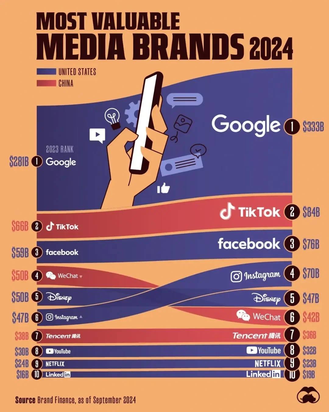 구글은 2023년 2810억 달러에서 2024년 3330억 달러로 브랜드 가치가 크게 상승하며 명실상부한 세계 최고의 미디어 브랜드임을 다시 한번 입증했습니다.