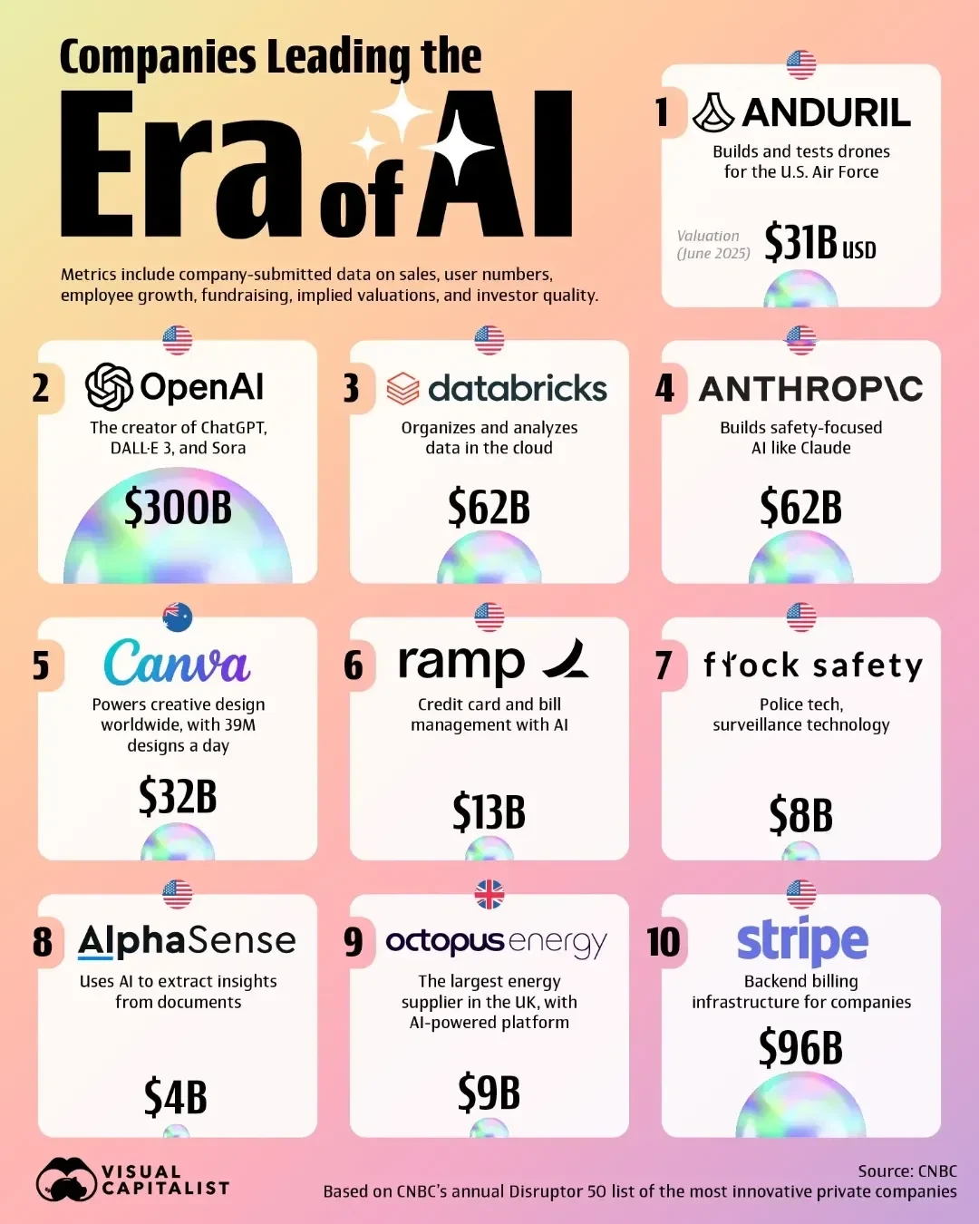 인공지능(AI)은 이제 단순한 기술 트렌드를 넘어, 모든 산업 분야에 혁신을 불어넣고 있는 거대한 패러다임 변화의 중심에 서 있습니다. 2025년 6월 현재, 전 세계적으로 수많은 AI 기업들이 등장하며 시장을 뜨겁게 달구고 있는 가운데, CNBC의 연례 ‘Disruptor 50’ 보고서는 가장 혁신적인 비상장 기업들을 선정해 AI 시대의 주역들을 조명했습니다. 비주얼 캐피탈리스트가 시각화한 이 자료는 AI 기술을 통해 각자의 분야에서 두각을 나타내고 있는 선도 기업들의 면모와 그들의 가치를 한눈에 보여줍니다.