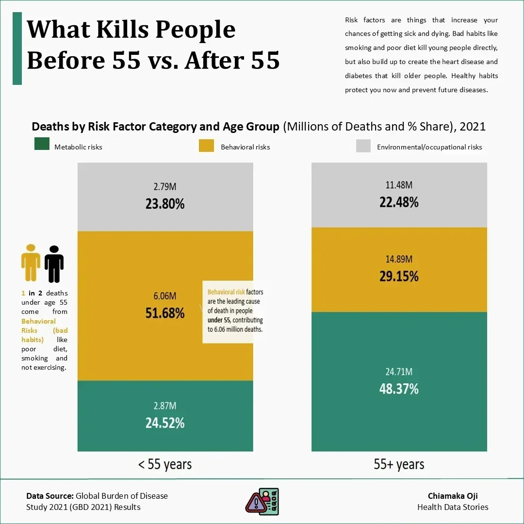 제공된 이미지는 55세 미만과 55세 이상 두 연령 그룹에서 사망을 초래하는 주요 위험 요인을 시각적으로 명확하게 보여줍니다. 이 데이터는 "Global Burden of Disease Study 2021"의 결과를 바탕으로 작성되었으며, 우리의 건강 수명에 대한 중요한 통찰력을 제공합니다.