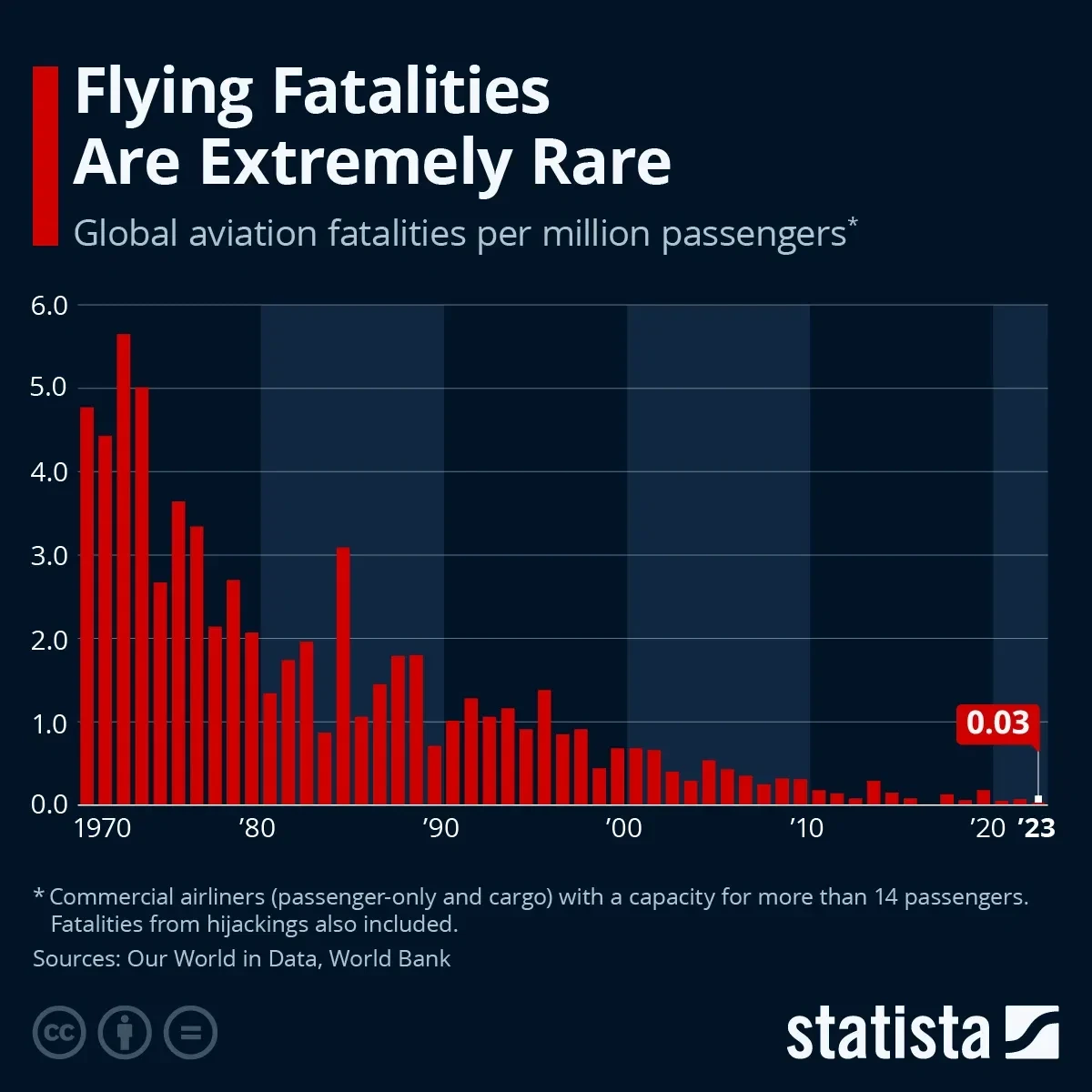 - 통계적으로 상업 항공은 지난 수십 년간 매우 안전해졌으며, 2023년은 100만 명당 0.03명의 사망률로 역대 두 번째로 안전한 해였습니다.