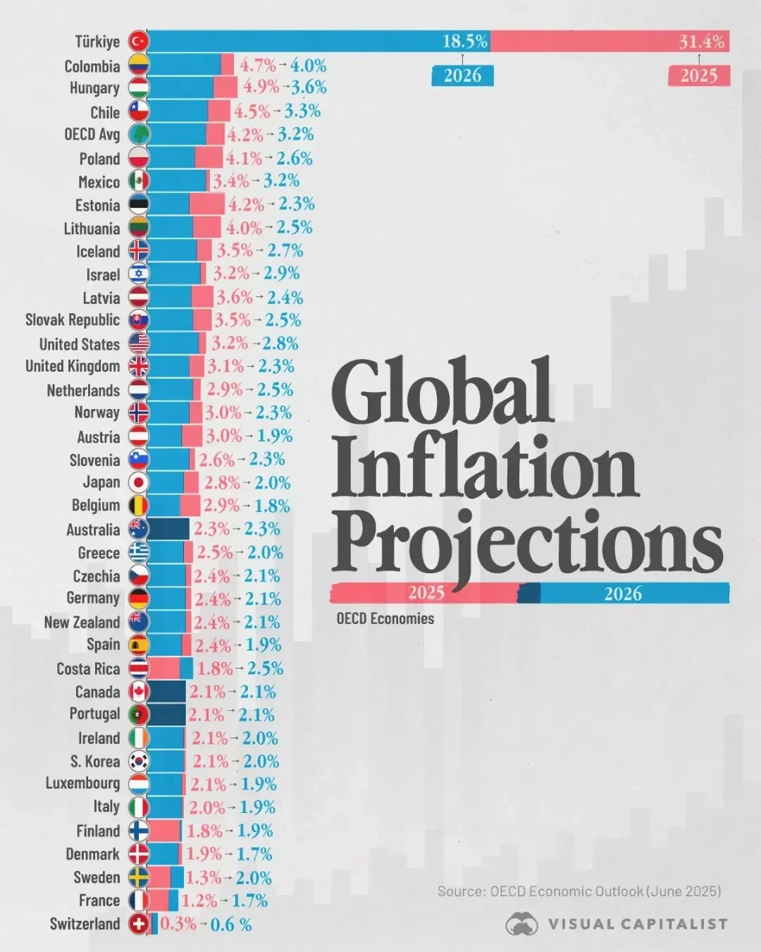 최근 공개된 OECD 경제 전망 보고서에 따르면, 글로벌 인플레이션은 2025년에도 상당한 수준을 유지할 것으로 보이며, 2026년에 들어서야 점진적인 하락세를 보일 것으로 예측됩니다. 특히 튀르키예와 콜롬비아는 OECD 회원국 중에서도 압도적으로 높은 인플레이션 수치를 기록하며 전 세계 경제 전문가들의 우려를 사고 있습니다.