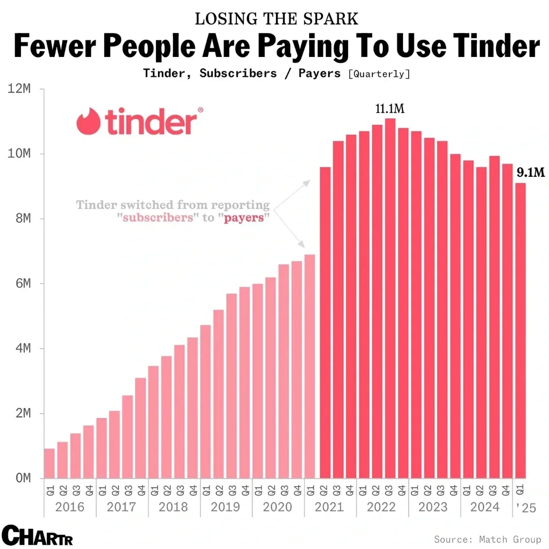 틴더의 유료 사용자(Payers) 수는 2022년 1분기에 1,110만 명으로 정점을 기록한 후 꾸준히 감소하여 2025년 1분기에는 910만 명까지 줄어들었습니다. 이는 약 200만 명의 유료 사용자가 이탈한 것으로, 2021년 4분기 이후 처음으로 1,000만 명 아래로 내려온 수치입니다.
