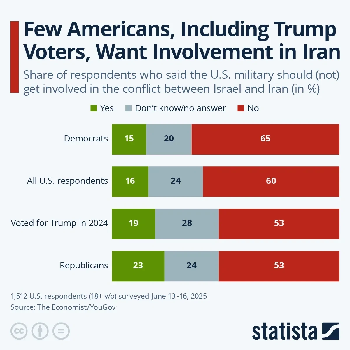 트럼프 대통령이 군사 개입 여부를 고심하고 있다는 보도가 나오는 가운데, 이코노미스트와 유고브의 최신 설문조사 결과는 미국 대중이 이러한 움직임에 대해 회의적인 시각을 가지고 있음을 분명히 보여줍니다. 전체 미국 응답자의 60%가 이스라엘-이란 분쟁에 대한 미국의 군사 개입에 반대하는 것으로 나타났습니다. 찬성하는 응답자는 16%에 불과했으며, 24%는 "모르겠다"고 답해 사안에 대한 불확실성 또는 판단 유보의 태도를 보였습니다.
