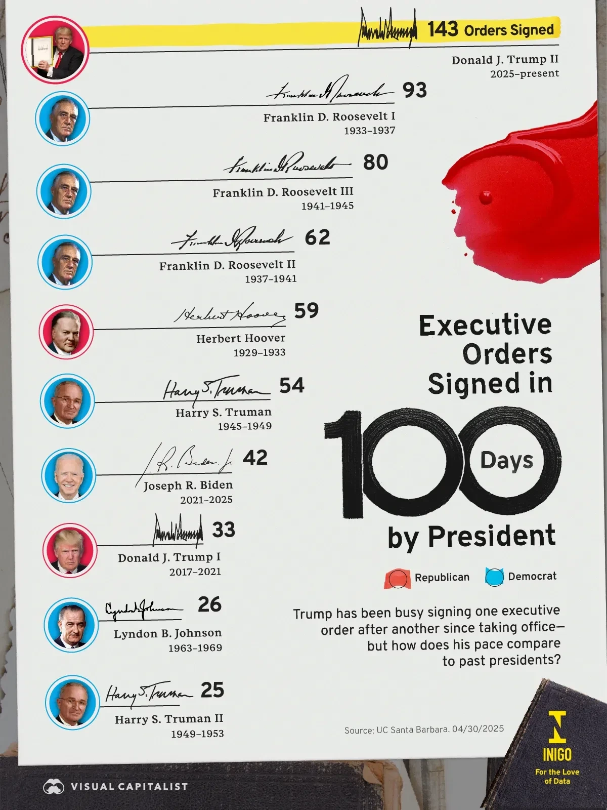 - '도널드 J. 트럼프 2세' 대통령은 취임 100일 만에 143개의 행정명령을 서명하여 역대 미국 대통령 중 가장 많은 기록을 세웠다.