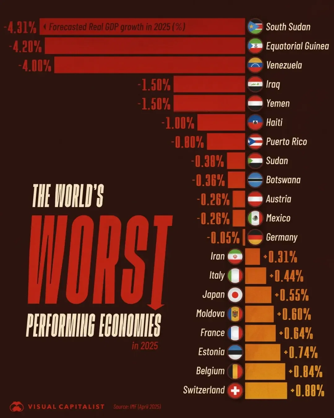 IMF의 예측에 따르면 2025년 가장 심각한 경제적 어려움을 겪을 국가는 남수단으로, 무려 -4.31%의 실질 GDP 성장률을 기록할 것으로 보인다. 이는 장기간의 내전과 정치적 불안정, 석유 생산량 감소 등이 복합적으로 작용한 결과로 분석된다. 남수단은 독립 이후에도 지속적인 갈등으로 인해 경제 기반 자체가 취약하며, 외부 지원에 크게 의존하는 상황이다.