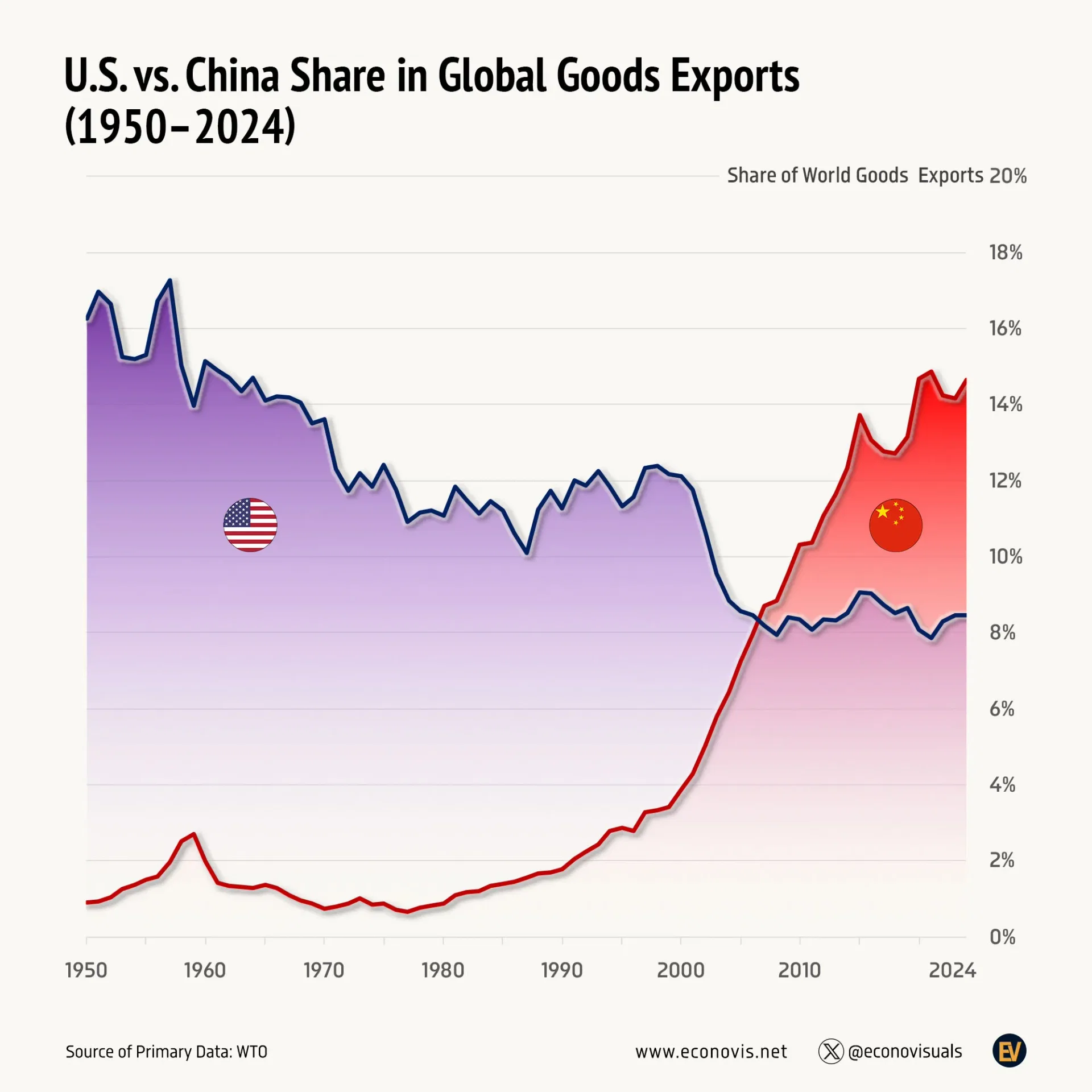 이러한 경쟁의 핵심 지표 중 하나는 바로 세계 상품 수출 시장 점유율입니다. 오늘날 우리가 목도하고 있는 미·중 갈등의 뿌리는 바로 이 수출 시장 점유율의 변화에서 찾아볼 수 있습니다. 1950년부터 2024년까지의 데이터를 통해 미국과 중국이 세계 상품 수출 시장에서 어떤 궤적을 그려왔는지 분석하고, 이를 통해 현재와 미래의 세계 경제 질서를 조망해보고자 합니다.
